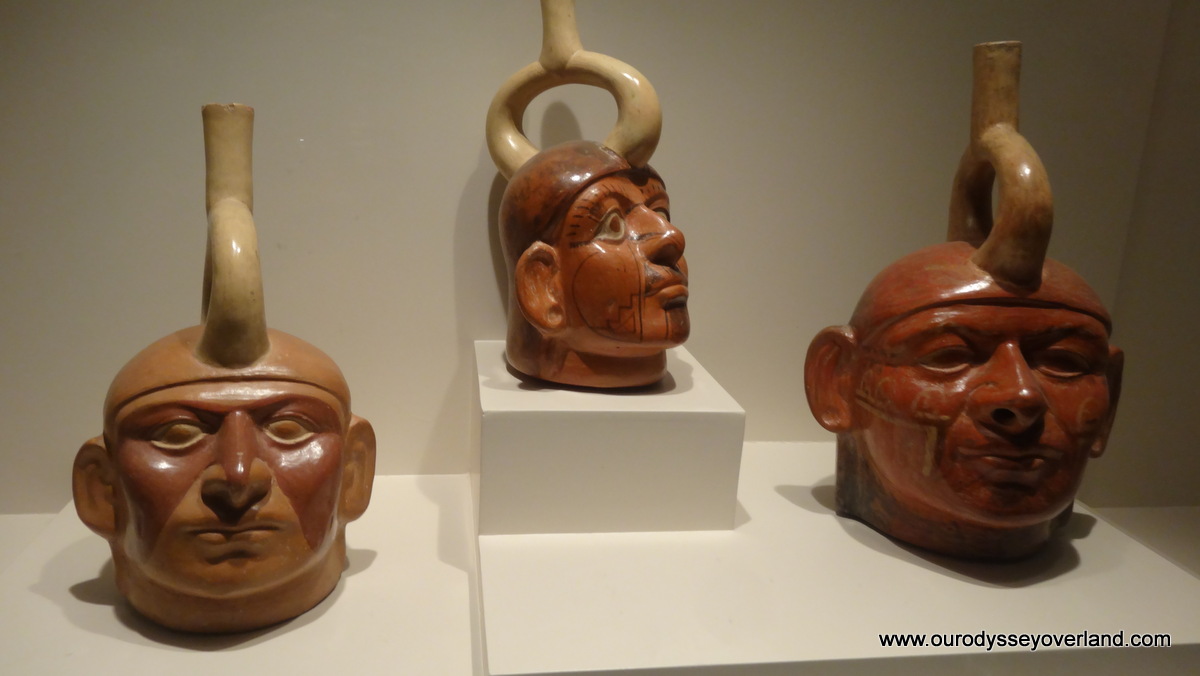 Moche portrait vases with stirrup handles. It is believed that these are portraits of the same person, made by different artists at different times. Historians have been able to learn a lot about Moche life due to the excellent craftsmanship of their cermanics.