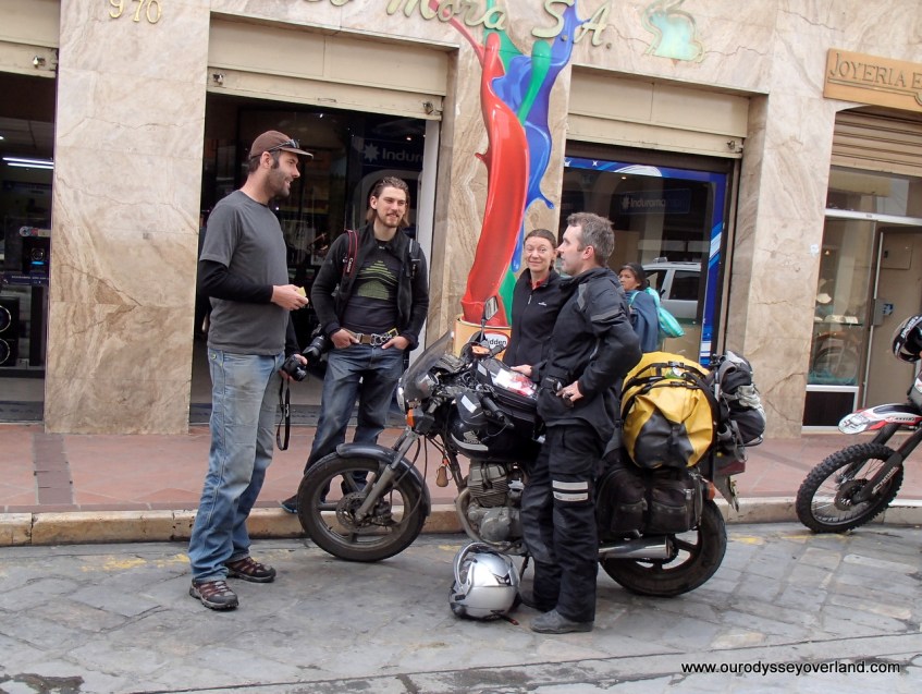 Published November 26, 2013 at 1280 × 963 in Passing through Ecuador Meeting new people can happen anywhere. On this occasion we were flagged down by Adrian (on the left) and Lauren, who recognised our New South Wales number plates. They were riding with Jeremy (middle) from France. Share this: Share on Facebook (Opens in new window) Facebook Share on X (Opens in new window) X Email a link to a friend (Opens in new window) Email Like Loading...