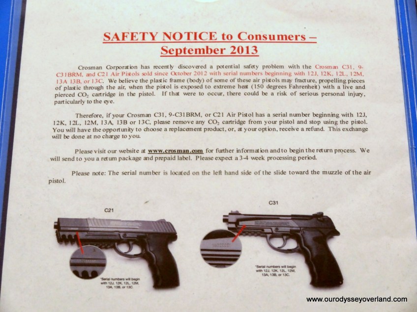 DSC03292 Published August 15, 2014 at 1600 × 1200 in Our Odyssey Overland American Style Hmm, the pistol you bought at Walmart might have a “potential safety problem”…. Share this: Share on Facebook (Opens in new window) Facebook Share on X (Opens in new window) X Email a link to a friend (Opens in new window) Email Like Loading...